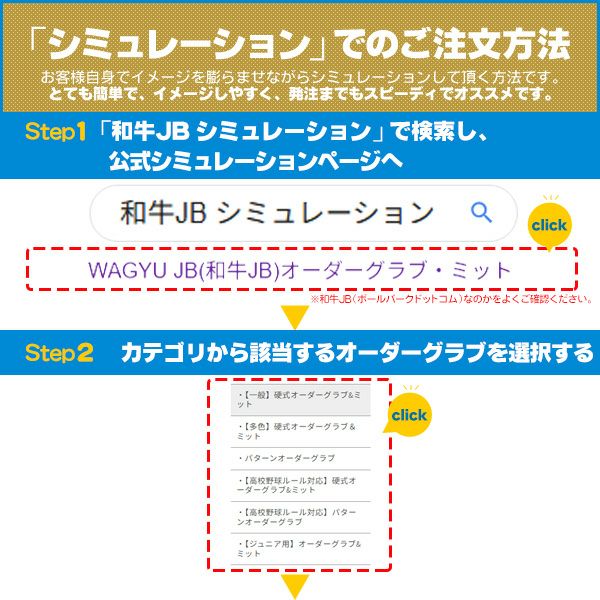 野球グローブ専門店ムサシは、和牛JB(wagyu JB)のオーダーグラブを取り扱っております。野球・ソフトボールのグローブオーダーを種目ごとに硬式用、軟式用、ソフトボール用、ポジションごとに投手用(ピッチャー用)、内野手用、外野手用、キャッチャーミット、ファーストミット、左投げ用(左利き)などを選んでオーダーすることができます。グローブのサイズや色のルールなど、分からないことがありましたらお気軽にご相談ください。